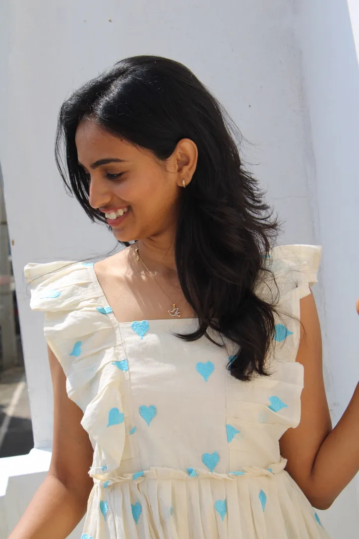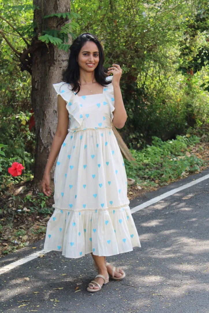This breezy midi dress features a soft off-white base adorned with delicate blue heart embroidery. Designed with a flattering square neckline, playful ruffle sleeves, and a tiered flared hem, it offers a romantic, easygoing silhouette that moves beautifully. Light, airy, and effortlessly feminine — perfect for sunny days and relaxed outings.