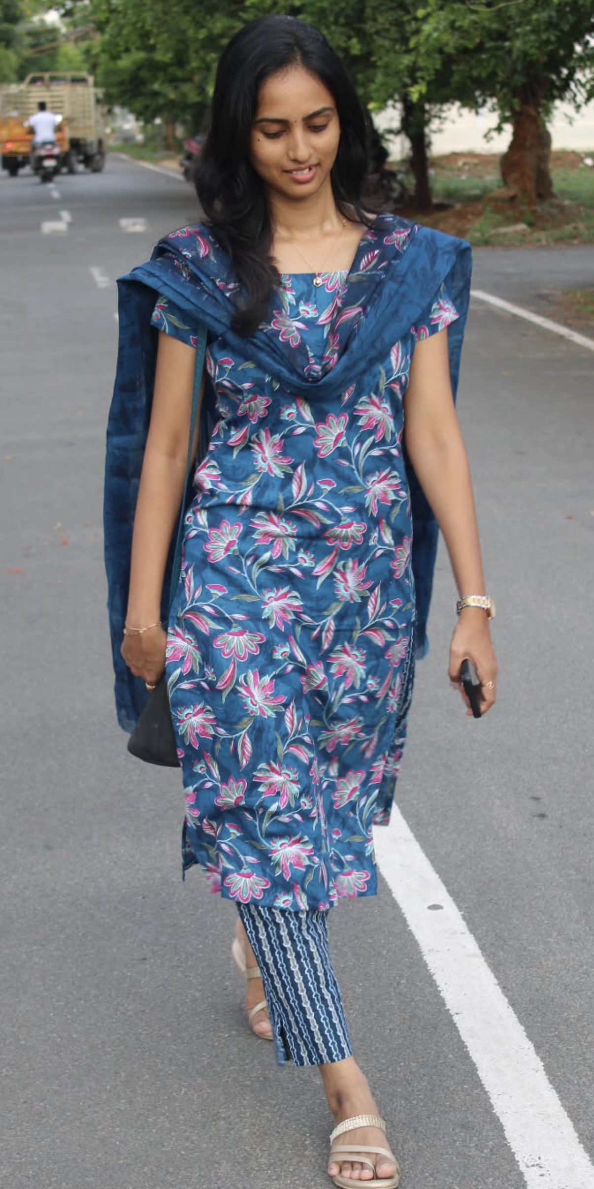 This blue floral kurta set pairs a soft printed kurta with matching dupatta and striped bottoms, creating a stylish yet effortless everyday outfit. Lightweight and breathable, it’s perfect for casual outings, college, or daily wear while keeping you comfortable all day.