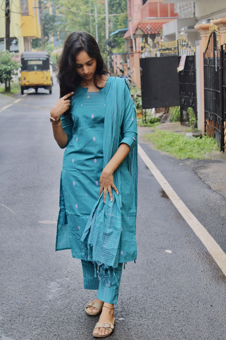 This teal kurta set is designed with subtle motifs and a softly textured dupatta that adds effortless charm. Comfortable, breathable, and refined—perfect for workdays that flow into casual evenings.