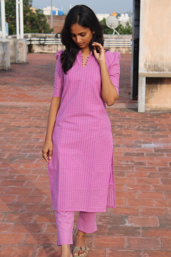 Designed in a calming lilac tone with delicate dotted motifs, this kurti set brings together comfort and understated elegance. The clean silhouette, breathable fabric, and matching straight pants make it perfect for workdays, casual outings, or relaxed everyday wear—easy to style and even easier to love.
