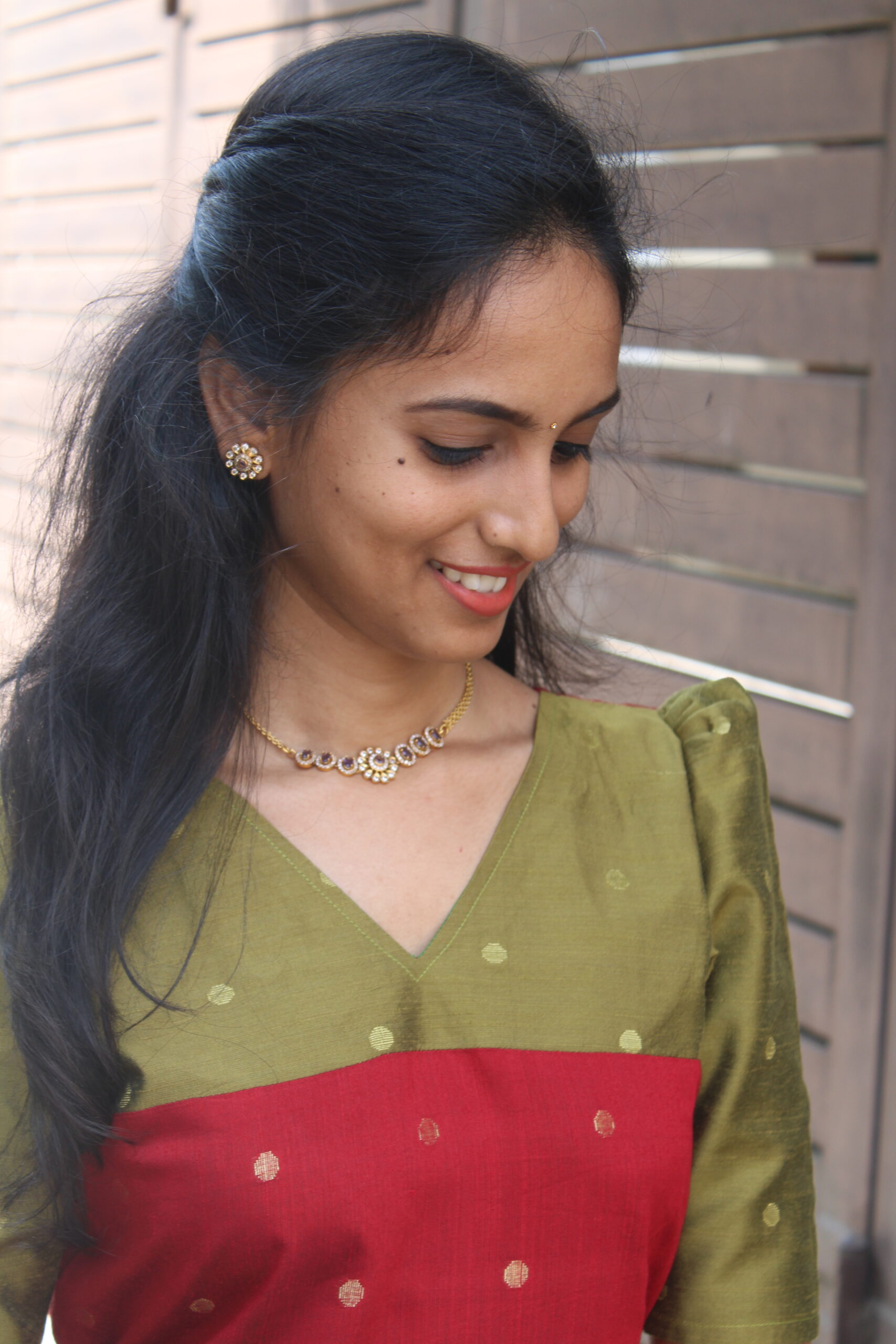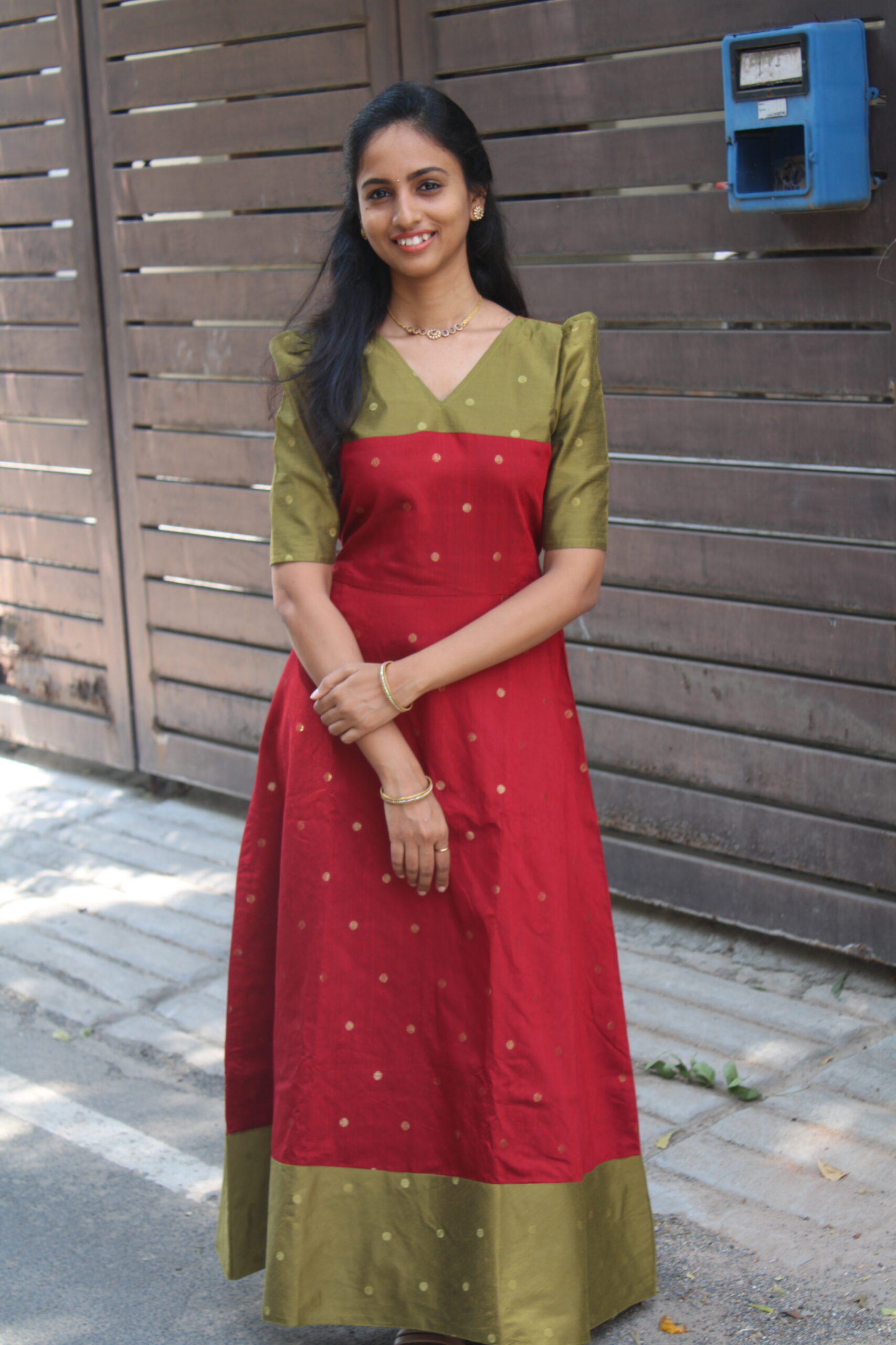 Designed in a rich dual-tone palette with subtle zari dot detailing, this dress features a flattering V-neckline and a beautifully flowing silhouette. Elegant yet comfortable, it’s perfect for festive gatherings, poojas, and special occasions where you want to feel effortlessly dressed and celebration-ready.