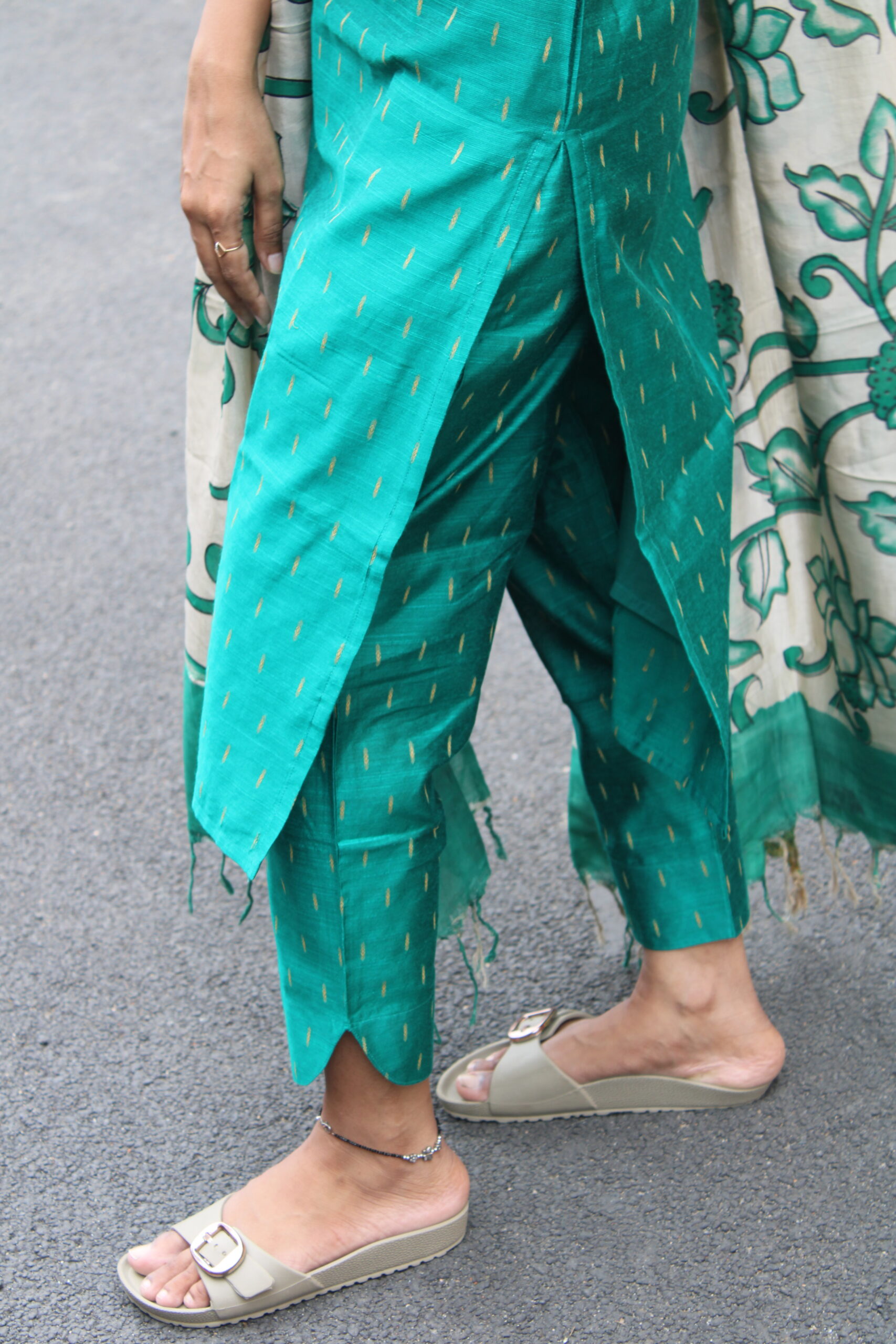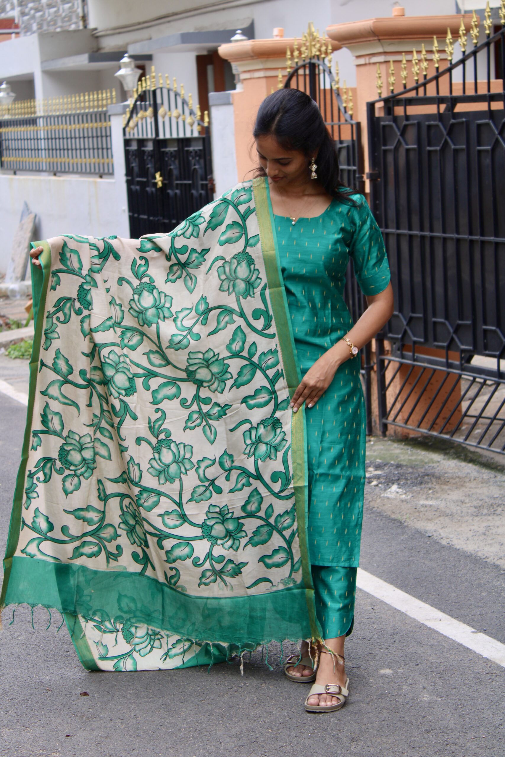 A refreshing peacock green kurta set paired with a statement floral dupatta for effortless elegance.