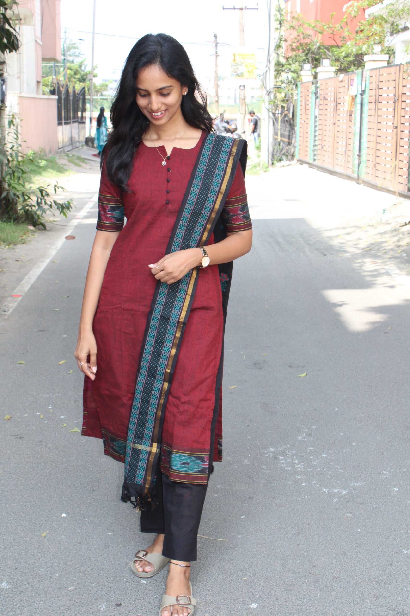 Crafted in a deep maroon hue, this salwar set features subtle sleeve accents and a beautifully contrasted dupatta with traditional patterns. Designed for comfort and effortless elegance, it’s perfect for festive gatherings, special occasions, or refined everyday wear.