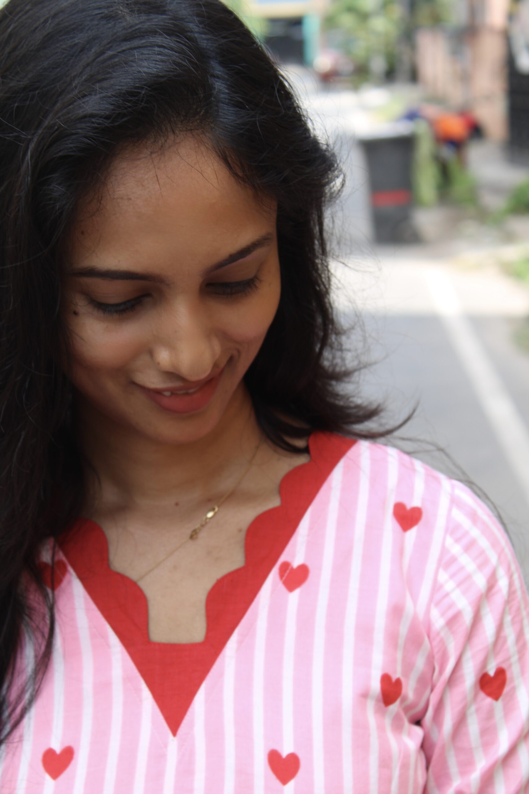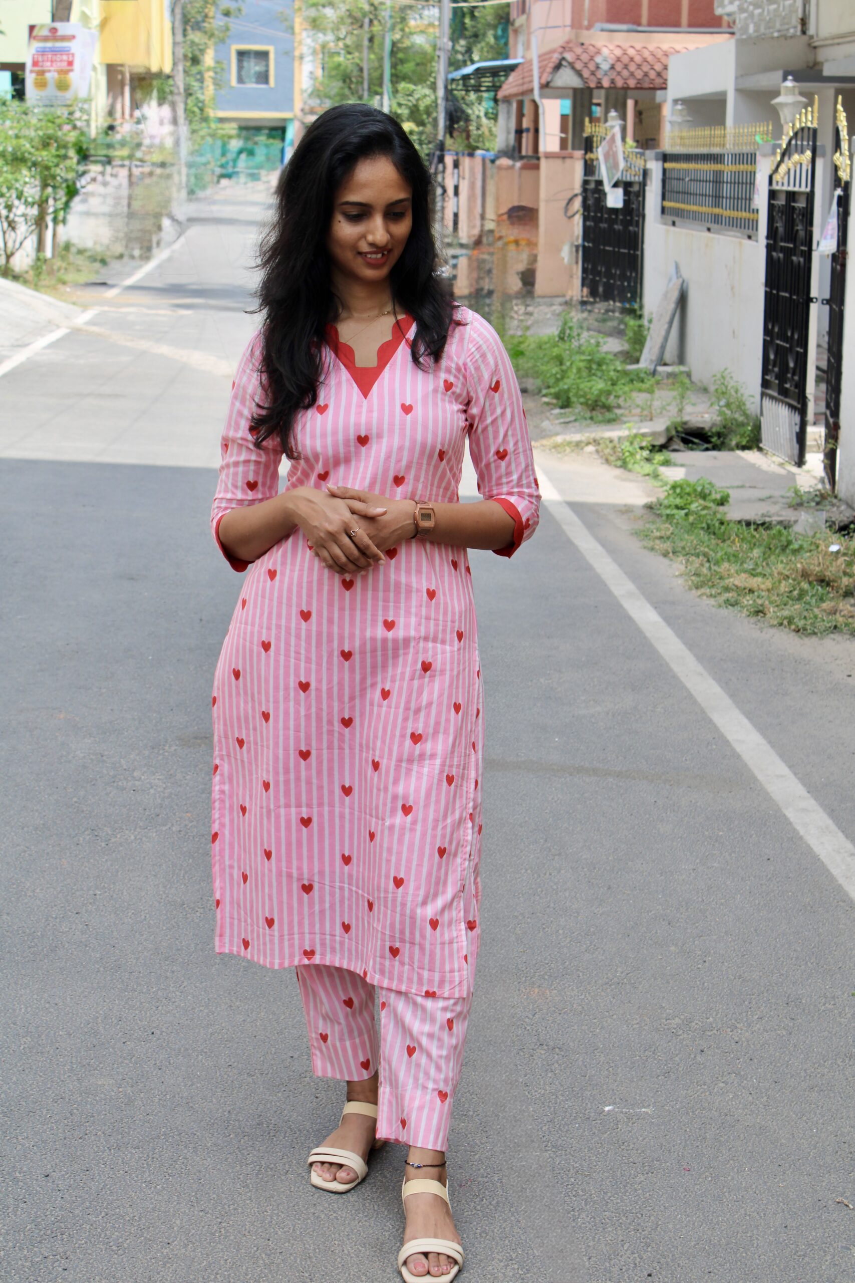 Add a touch of sweetness to your wardrobe with this soft pink striped kurta set adorned with delicate heart motifs. Designed for comfort and style, it features a flattering straight-cut kurta paired with matching pants, making it perfect for casual outings, brunch dates, or relaxed festive moments. Lightweight, breathable, and easy to wear, it blends cute aesthetics with everyday elegance. ✨