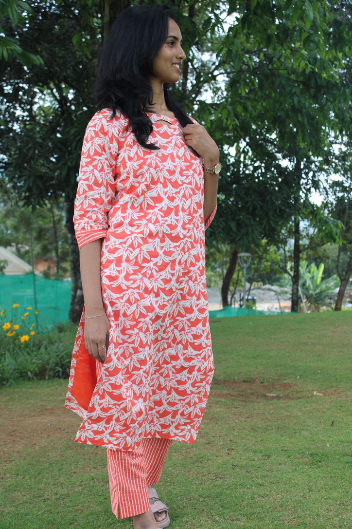 This peach-orange printed kurti features a soft floral pattern with a subtle keyhole neckline and 3/4 sleeves. Lightweight, breathable, and easy to pair with leggings or jeans, it’s ideal for daily wear, work, and casual outings while keeping you cool and comfortable.
